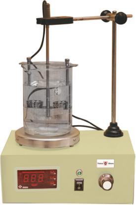 环球软化点测定仪有一个带可调加热装置和温度数字显示的磁力搅拌器。每套设备都有耐热玻璃材质的流体浴装置、锥形环、钢球扶正器、钢球、环架和加热板。